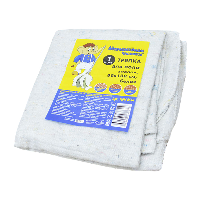 Тряпка для пола ТМ "Мамонтенок Чистолюб" х/б белая 80 х 100 см. Более прочная и долговечная тряпка для пола. Хлопковый состав обеспечивает отличную впитываемость и мягкость. Отлично собирает грязь и влагу, моет, не оставляя полос и ворсинок. Прекрасно держится на щетке швабры, легко отжимается. Прекрасно подойдет для мытья всех напольных поверхностей, в том числе и паркета, камня, кафельной и керамической плитки. Большой размер полотна позволяет легко и быстро очищать большие поверхности. Подходят людям страдающим аллергией, в детских учреждениях.